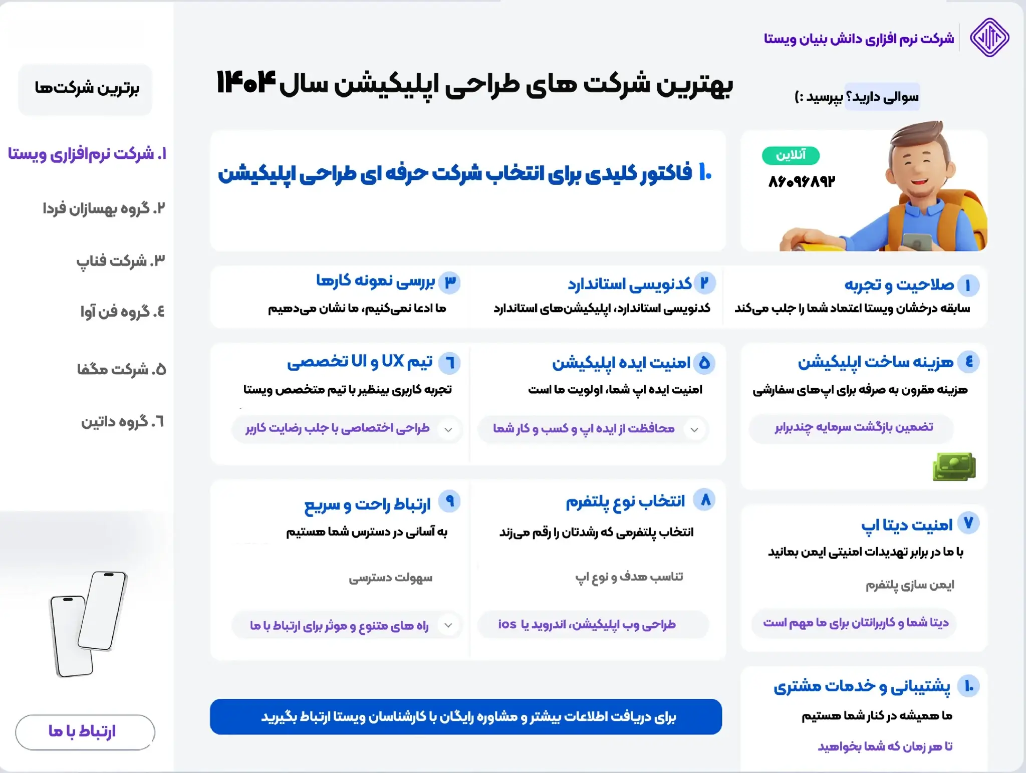 تیم ویستا با تجربهای گرانبها در پروژههای متنوع، ۱۰ معیار بنیادین برای تشخیص یک شرکت ممتاز ارائه میکند. معیارهایی همچون کیفیت نمونهکارها، توانایی طراحی اپلیکیشن اختصاصی، پشتیبانی مستمر، مقیاسپذیری پروژهها و امنیت دادهها. این عوامل، چارچوبی روشن در اختیار شما میگذارند تا بتوانید از میان گزینههای موجود، شرکتی را برگزینید که آیندهی دیجیتال برندتان را نه با شعار، بلکه با عمل تضمین کند: