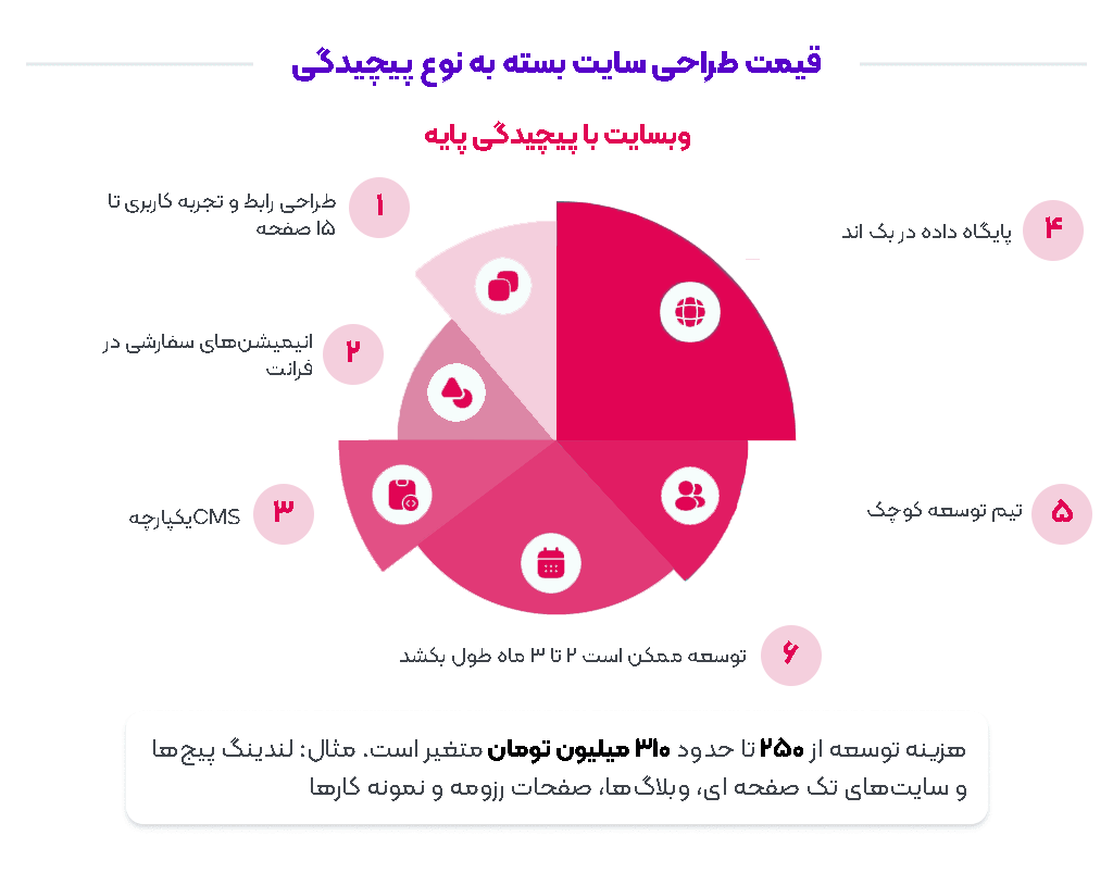 در ادامه، هزینه طراحی سایت را با تمرکز بر سطح پیچیدگی و امکانات مورد نیاز بررسی خواهیم کرد تا کاربر بتواند دقیقتر ارزیابی کند که پروژه او در چه محدودهای از نظر قیمت قرار دارد.